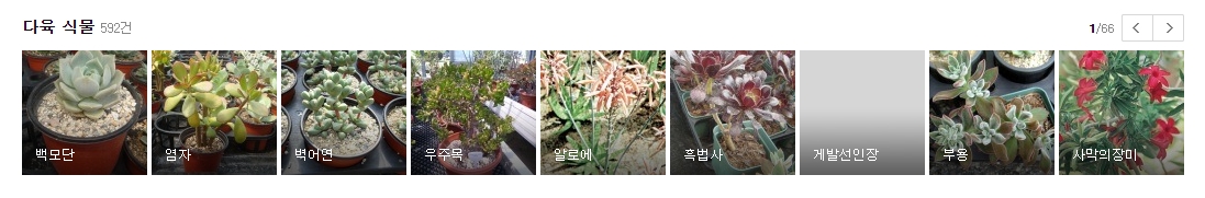 페이지 상단에 위치한 검색창에 '다육이'라고 입력하고 검색 버튼을 누르면, 관련된 모든 정보를 보여줍니다. 식물의 이름 전체를 알지 못하더라도, '선인장'이나 '알로에'처럼 큰 분류로 검색을 시작해볼 수도 있습니다.