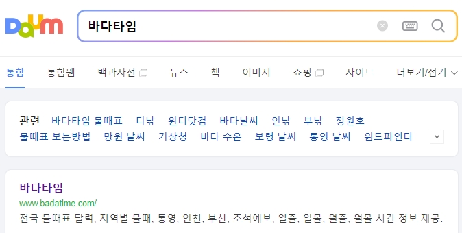 바다타임 홈페이지에 접속합니다. 이 웹사이트는 전국 각지의 물때 정보를 제공하는 서비스입니다.