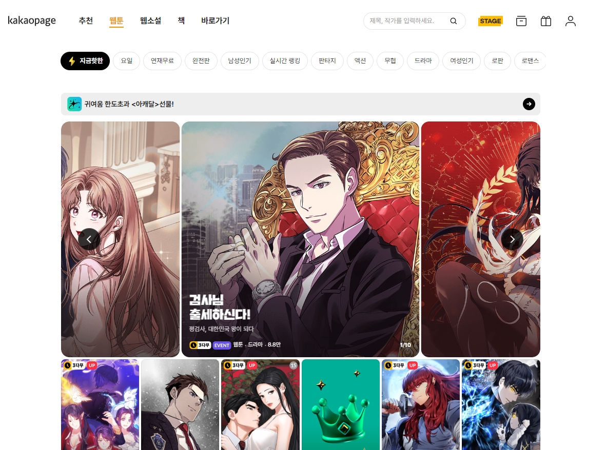 홈페이지 상단 메뉴를 보면 웹툰, 웹소설, 책 등 주요 콘텐츠로 바로 이동할 수 있는 링크가 마련되어 있습니다. 마우스를 이용해 원하는 메뉴를 클릭하면, 해당 장르의 인기 작품이나 최신 업데이트 작품 목록을 한눈에 확인할 수 있습니다.