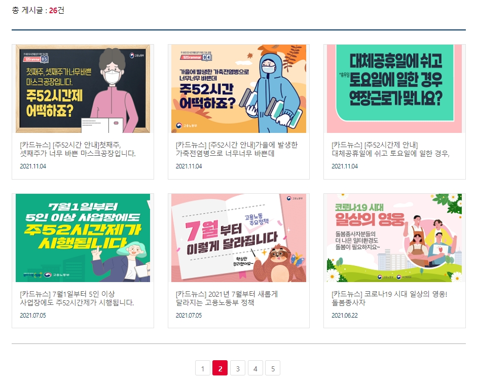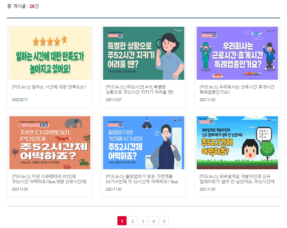검색창에 핵심 키워드인 '주52시간'을 입력하고 검색을 실행해 보세요. 그러면 주 52시간 제도와 관련된 다양한 사례와 설명이 담긴 카드뉴스 목록이 화면에 나타나 편리하게 확인할 수 있습니다.