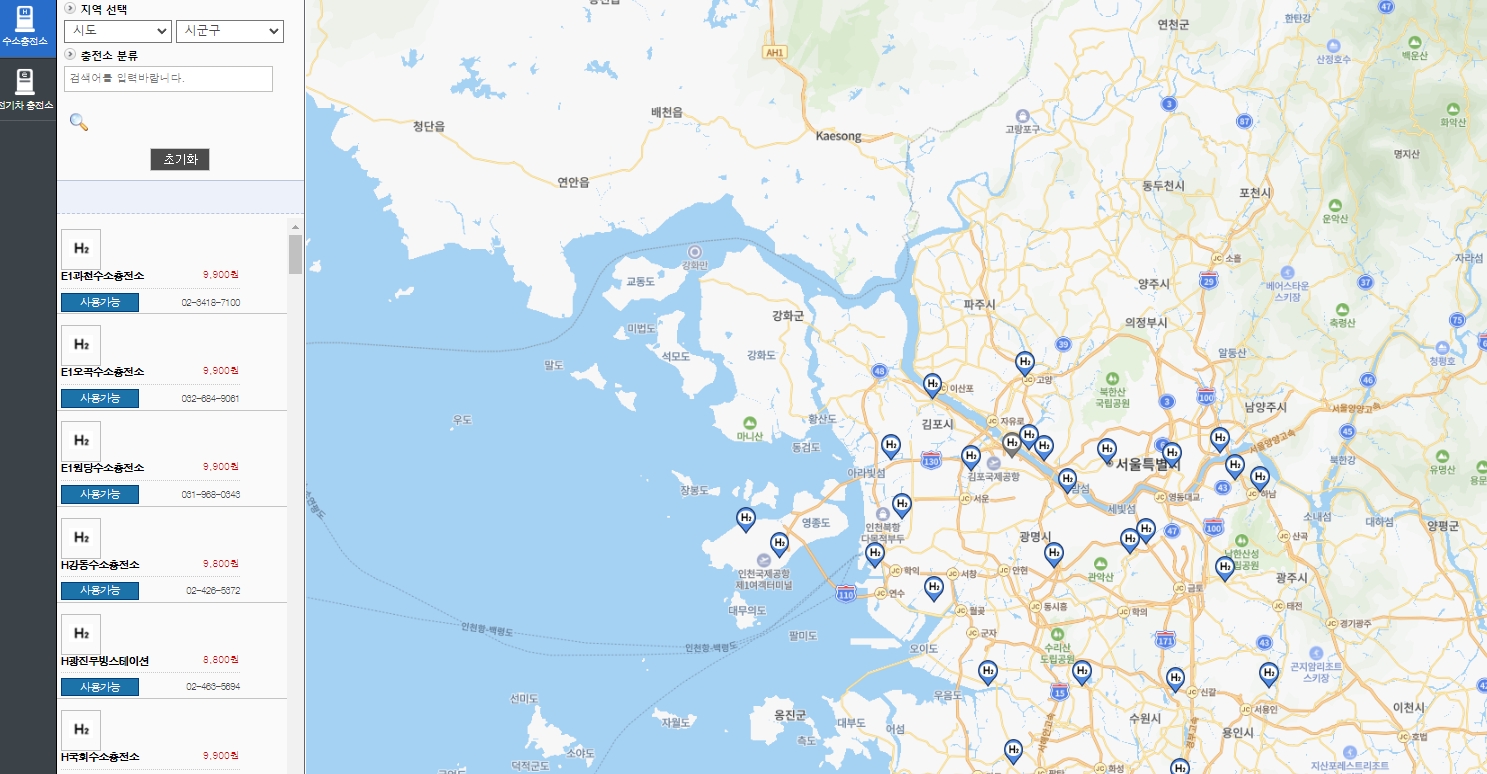 지도가 나타나면 현재 운영 중인 모든 수소 충전소가 표시됩니다. 지도 위 아이콘을 통해 충전소의 위치를 직관적으로 파악할 수 있으며, 지도를 확대하거나 이동하여 내 주변의 충전소를 쉽게 찾을 수 있습니다.