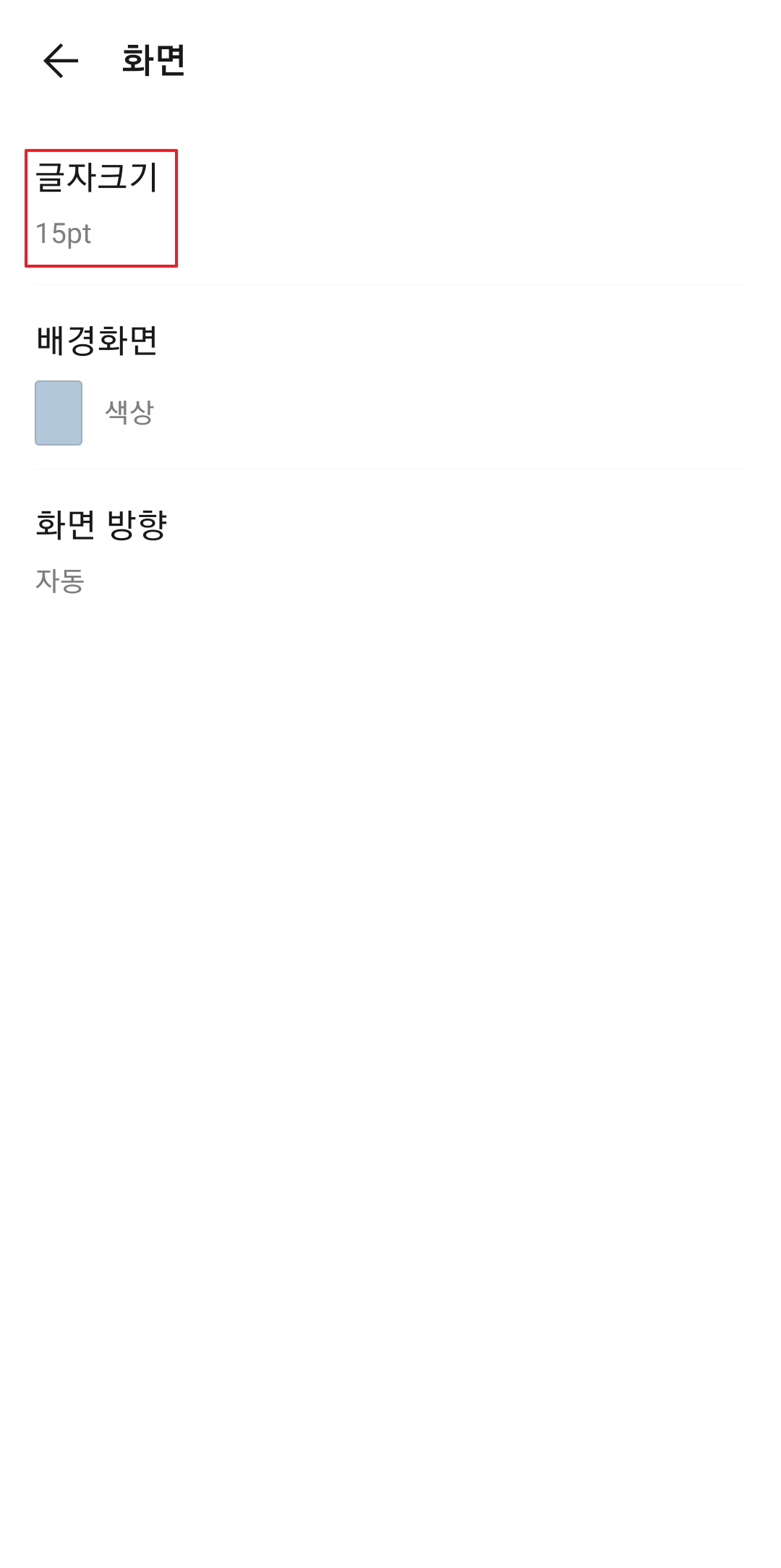 '화면' 메뉴를 누르면 가장 위쪽에 '글자크기' 항목이 바로 보일 거예요. 이 부분을 누르면 드디어 대화창의 글씨 크기를 직접 바꿀 수 있는 조절 화면으로 이동하게 됩니다. 거의 다 왔으니 조금만 더 따라오세요.