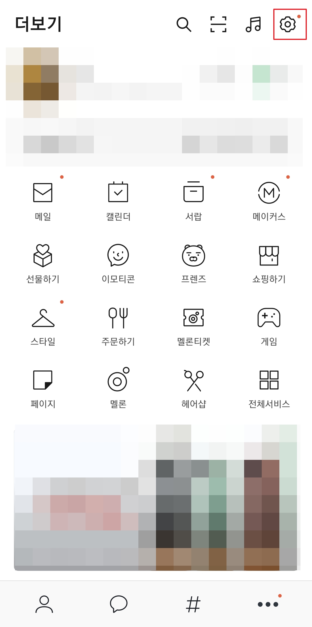 더보기 화면으로 이동하면 다양한 메뉴가 나타나는데, 여기서 오른쪽 맨 위에 있는 톱니바퀴 모양의 아이콘을 선택하면 됩니다. 이 아이콘이 바로 카카오톡의 모든 기능을 관리할 수 있는 설정 메뉴로 들어가는 입구랍니다.