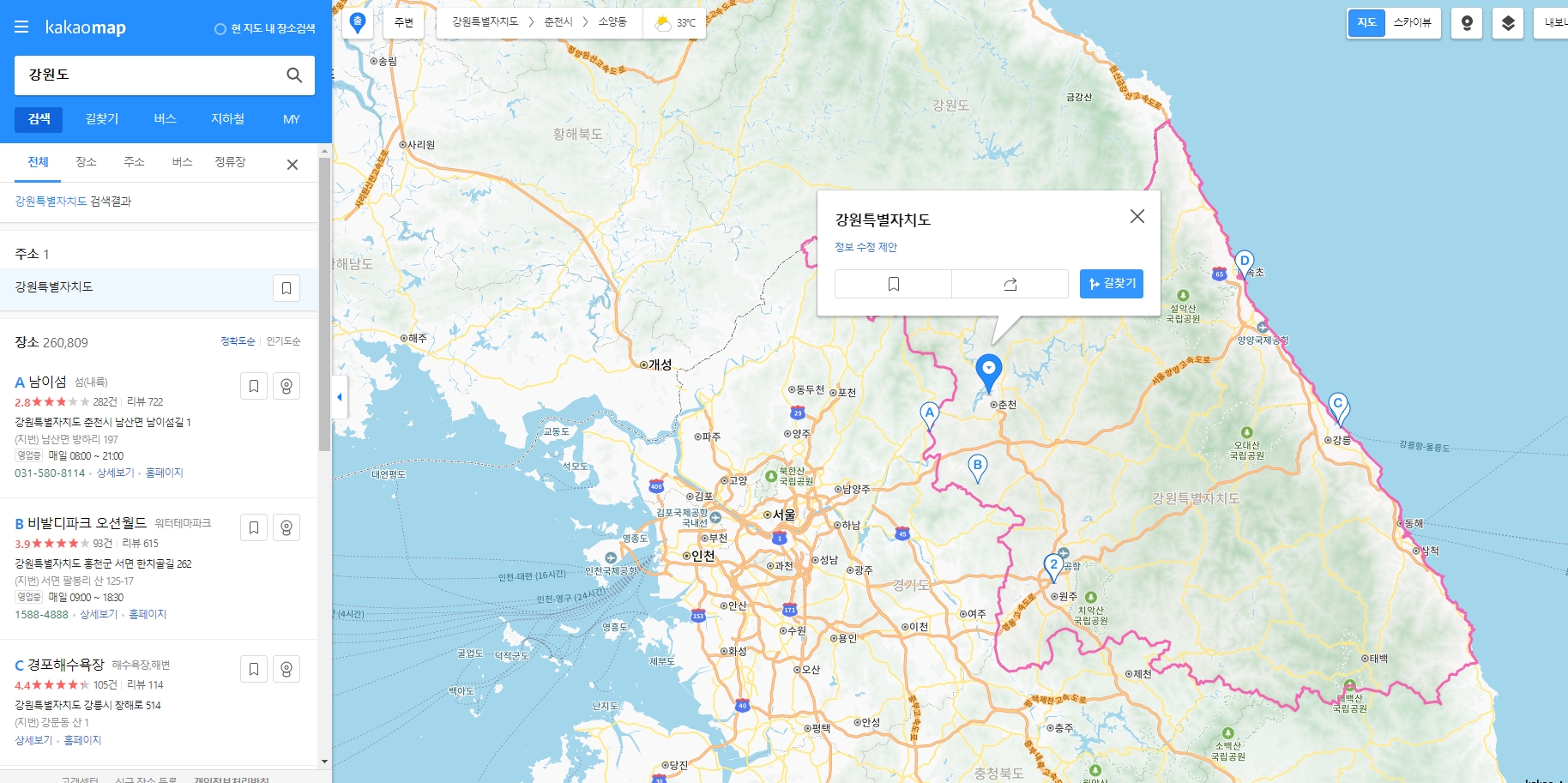 검색 결과로 지도상에 강원도가 분홍색 선으로 표시됩니다.