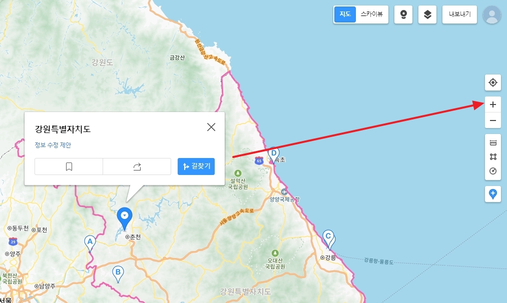 지도 검색창에 강원도를 입력하여 강원도 지역을 검색합니다.