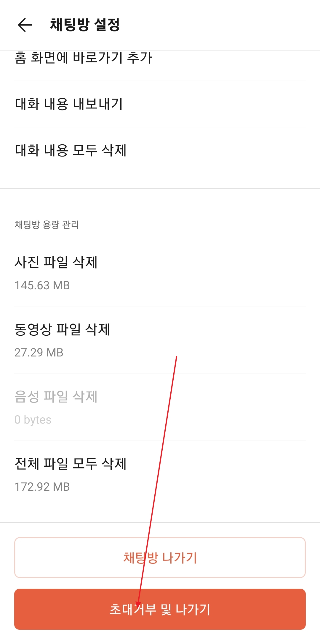 '채팅방 설정'으로 들어오셨다면, 화면을 맨 아래까지 쭉 내려보세요. 가장 밑에 붉은색 글씨로 '초대거부 및 나가기'라는 버튼이 보일 거예요. 일반 '나가기' 버튼과 다르니 꼭 확인하셔야 해요.