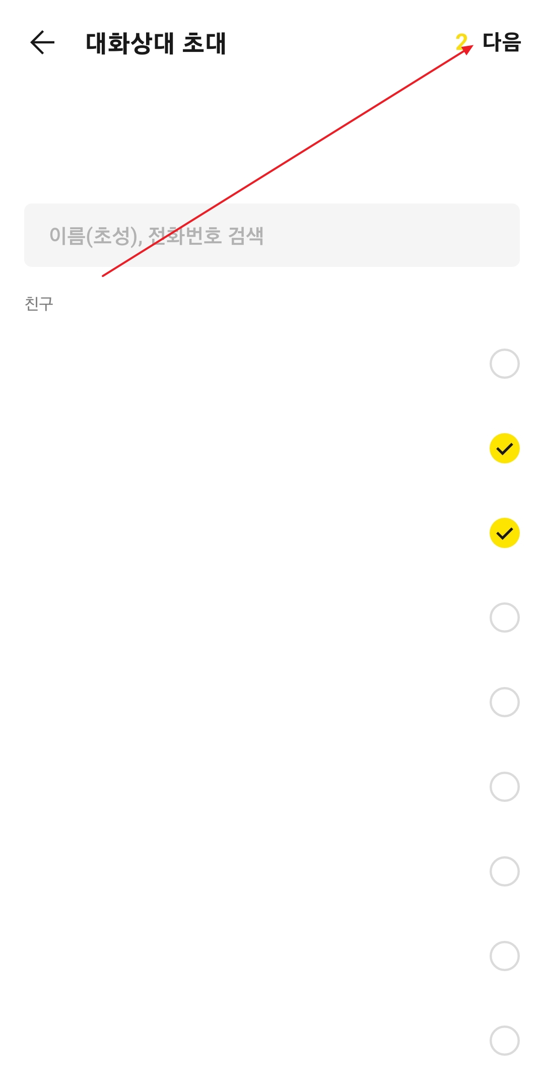 '대화상대 초대'를 누르면 내 친구 목록이 나타납니다. 여기서 함께하고 싶은 친구들의 프로필을 하나씩 선택하고, 오른쪽 위에 있는 '확인' 버튼을 누르면 초대가 완료됩니다. 참 간단하죠?