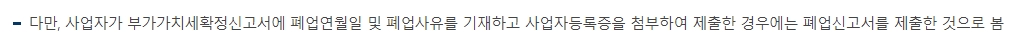 부가가치세 확정 신고서에 폐업 연월일과 폐업 사유를 기재하고 사업자등록증을 첨부하여 제출하는 경우, 별도의 폐업신고서 제출이 필요하지 않습니다.