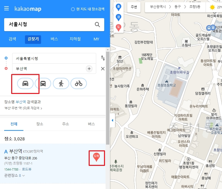출발지와 도착지가 모두 세팅되면 경로 탐색 화면이 나오는데, 여기서 반드시 상단에 있는 자동차 모양 아이콘을 눌러주셔야 해요. 대중교통이나 도보로 되어 있으면 유류비 정보가 아예 안 뜨거든요.
