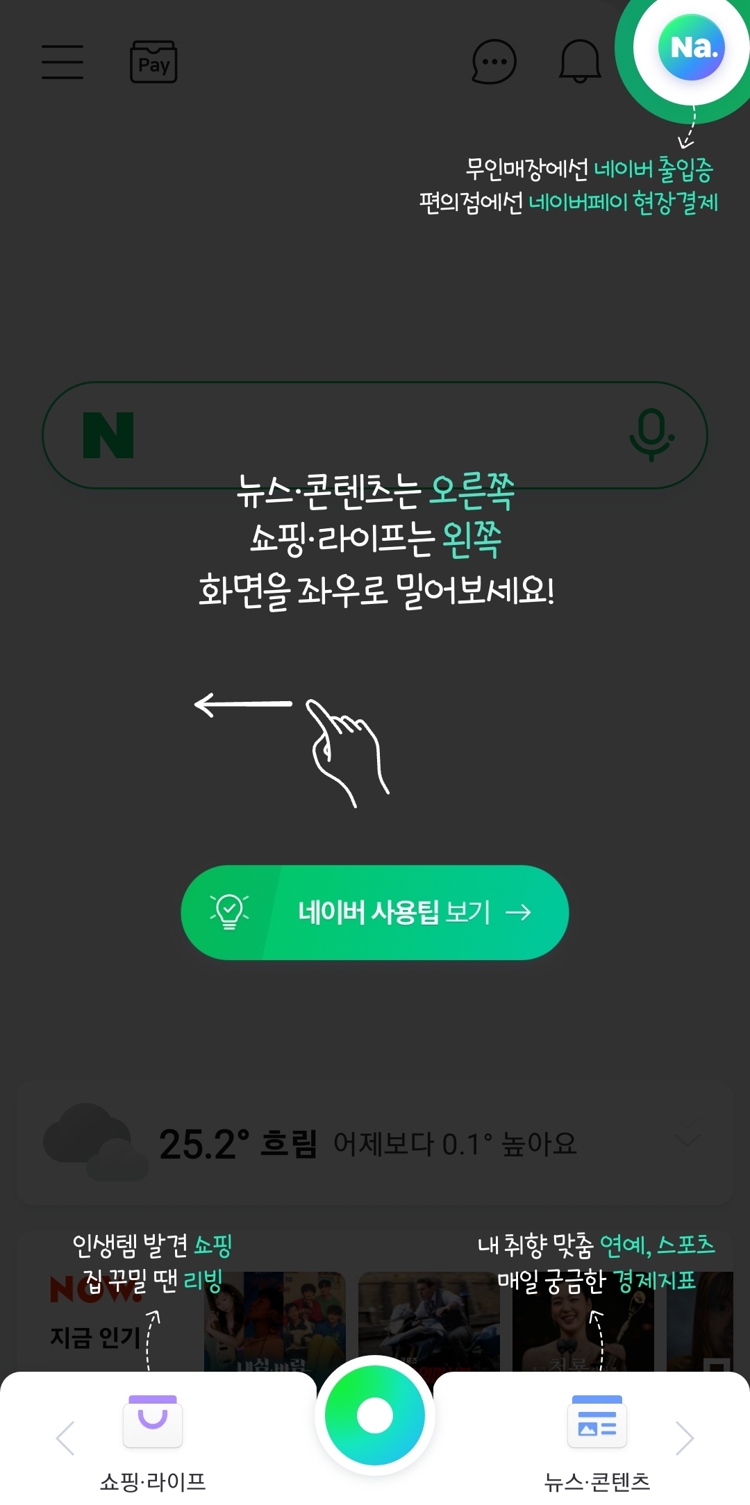드디어 익숙한 네이버 메인 화면이 떴다면 설치 성공입니다. 화면을 넘겨보시면 웹 브라우저와는 다른 편리한 제스처 기능이나 단축키 팁들이 나오는데 한 번쯤 봐두면 꽤 쓸만하더라고요.
