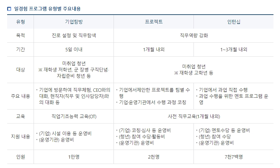지원 내용으로는 청년들의 수요에 맞춘 다양한 일경험 프로그램을 제공합니다. 예를 들어, 기업 탐방 프로그램은 기업 방문을 통해 직무 체험, 현직자 멘토링, CEO나 인사 담당자와의 대화 등을 제공하여 진로 설정과 직무 탐색을 지원합니다. 프로젝트 방식의 일경험 프로그램은 실전형 프로젝트 수행을 통해 직무 기반 역량을 강화시킵니다. 인턴형 프로그램은 국내외 우수기업에서 실전 직무 역량을 키울 수 있는 기회를 제공합니다.