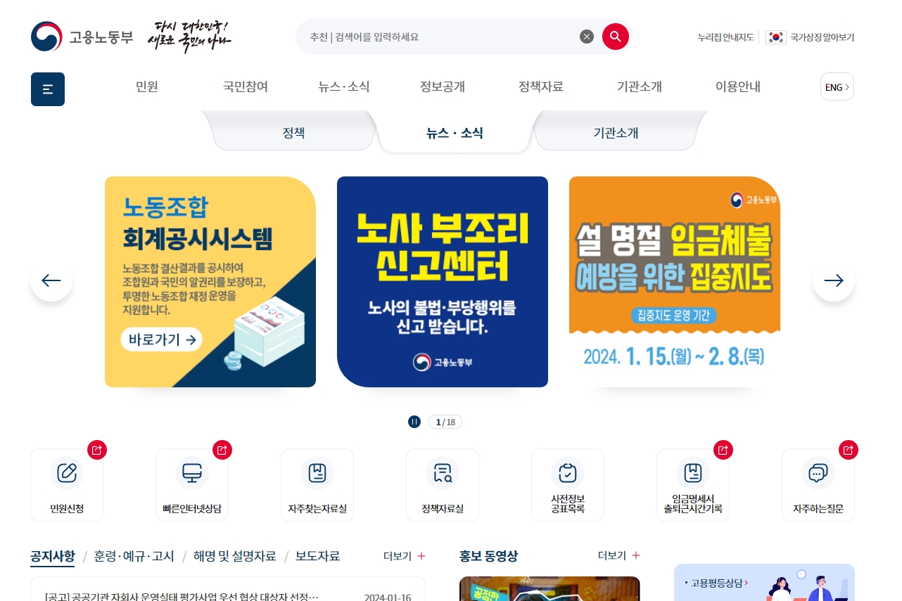 고용노동부 홈페이지에 접속합니다. 이곳에서는 고용과 노동에 관한 다양한 정보와 서비스를 제공합니다.