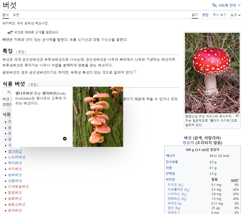 여기서 정말 유용한 팁을 하나 드릴게요. 궁금한 버섯 이름이 보인다고 무조건 클릭해서 페이지를 이동할 필요가 없습니다. 저도 예전엔 일일이 다 눌러봤는데, 마우스 커서만 살짝 올려도 미리 보기 팝업이 뜨거든요.