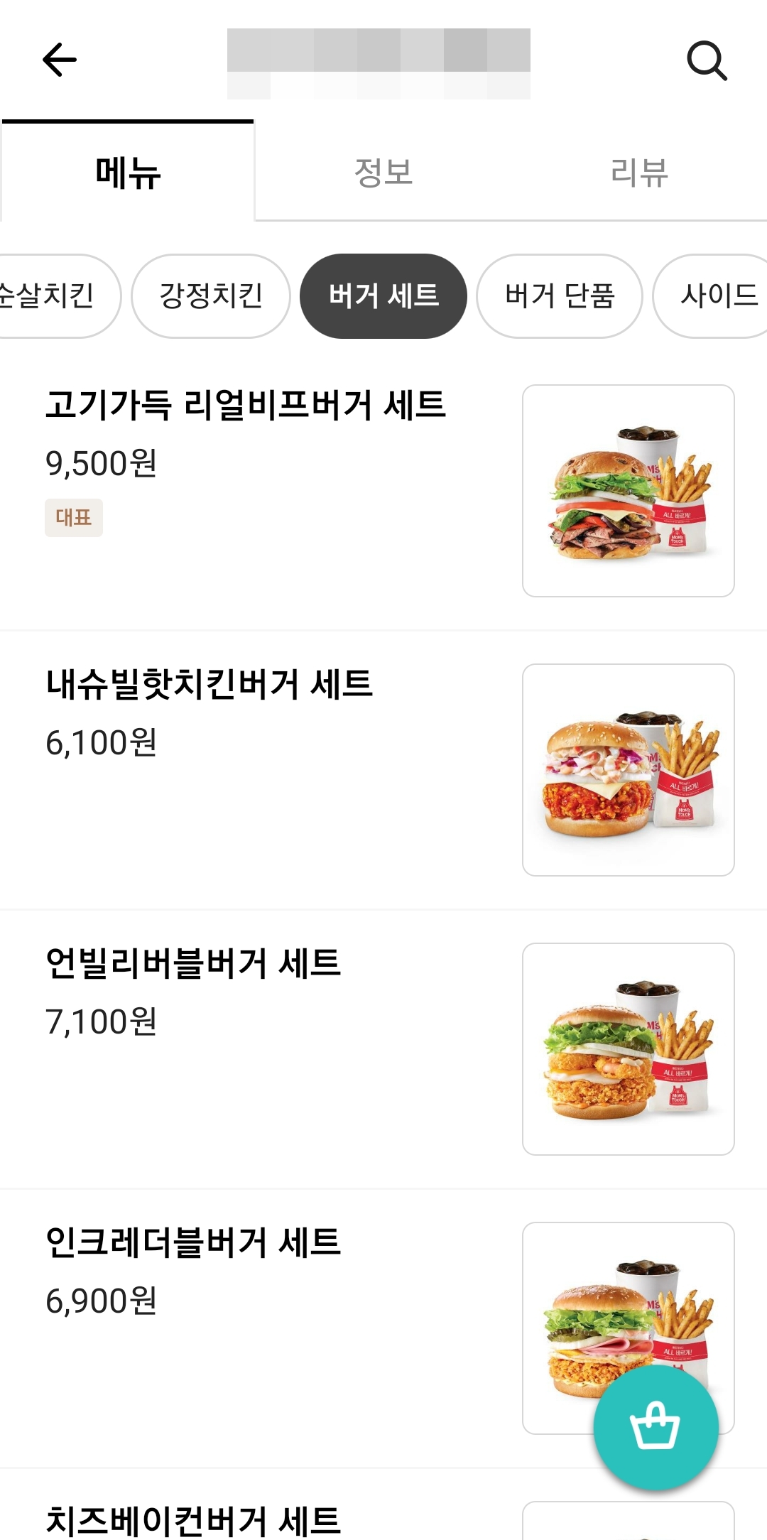 카테고리를 열어보면 치킨, 버거, 사이드, 음료 등 메뉴 구성은 아주 상세하게 나뉘어 있어요. 신메뉴가 뭐가 나왔는지 훑어보기에는 딱 좋았는데요.