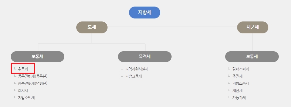 지방세 - 도세 - 보통세 - 취득세 순으로 메뉴를 클릭하여 취득세에 관한 정보를 찾아갑니다. 취득세는 부동산 취득 시 부과되는 세금으로, 주택 취득에도 적용됩니다.