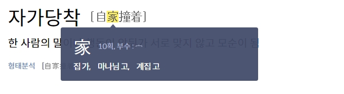 한자 구성을 하나씩 뜯어보면 이해가 더 빨라요. 먼저 앞의 두 글자인 '자가(自家)'는 스스로 자(自)에 집 가(家)를 쓰는데요. 여기서 '집'은 단순히 사는 곳이 아니라 '자기 자신'이나 '그 사람 자체'를 의미하는 경우가 많아요.