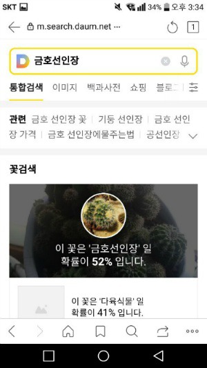 결과 화면을 보시면 '금호선인장일 확률이 52%'라고 분석된 것을 확인할 수 있습니다. 확률이 조금 낮게 나온 건 제가 사진을 대충 찍어서 그런 건데, 각도를 잘 맞춰서 다시 찍으니 90% 이상까지 올라가더라고요.