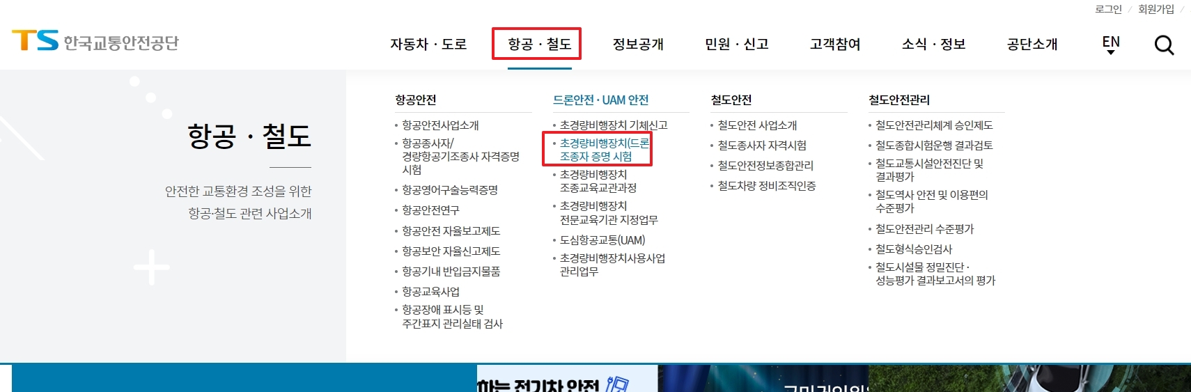 항공/철도 메뉴를 선택한 후 드론안전 · UAM 안전 섹션에 있는 초경량비행장치(드론) 조종자 증명 시험을 클릭합니다. 여기서는 드론 조종에 관한 자격증 취득 정보를 제공합니다.