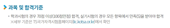 시험의 과목 및 합격 기준은 학과시험의 경우 70점 이상(100점 만점)이며, 실기시험의 경우 모든 항목에서 만족(S) 등급을 받아야 합니다. 세부 기준은 TS국가자격시험 홈페이지에서 확인할 수 있습니다.