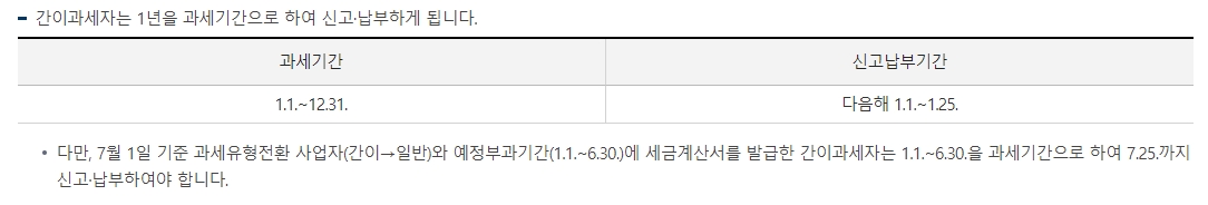 간이과세자의 경우, 1년을 과세기간으로 하여 신고 및 납부해야 합니다. 이 경우, 과세기간은 1월 1일부터 12월 31일까지이며, 다음해 1월 1일부터 1월 25일까지 신고 및 납부해야 합니다.