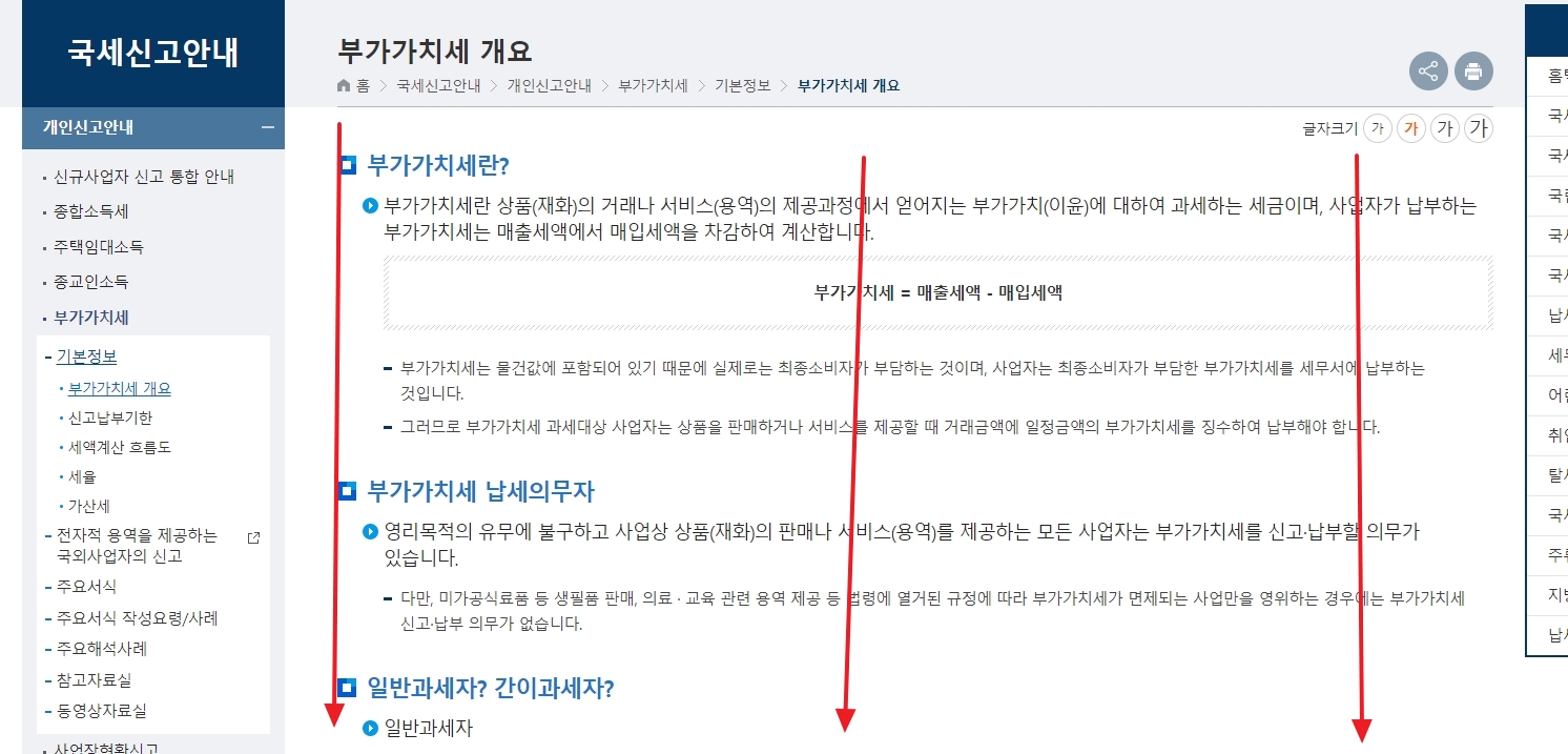 부가가치세 개요 페이지에서 부가세 신고 관련 정보를 확인할 수 있으며 페이지를 아래로 내립니다.