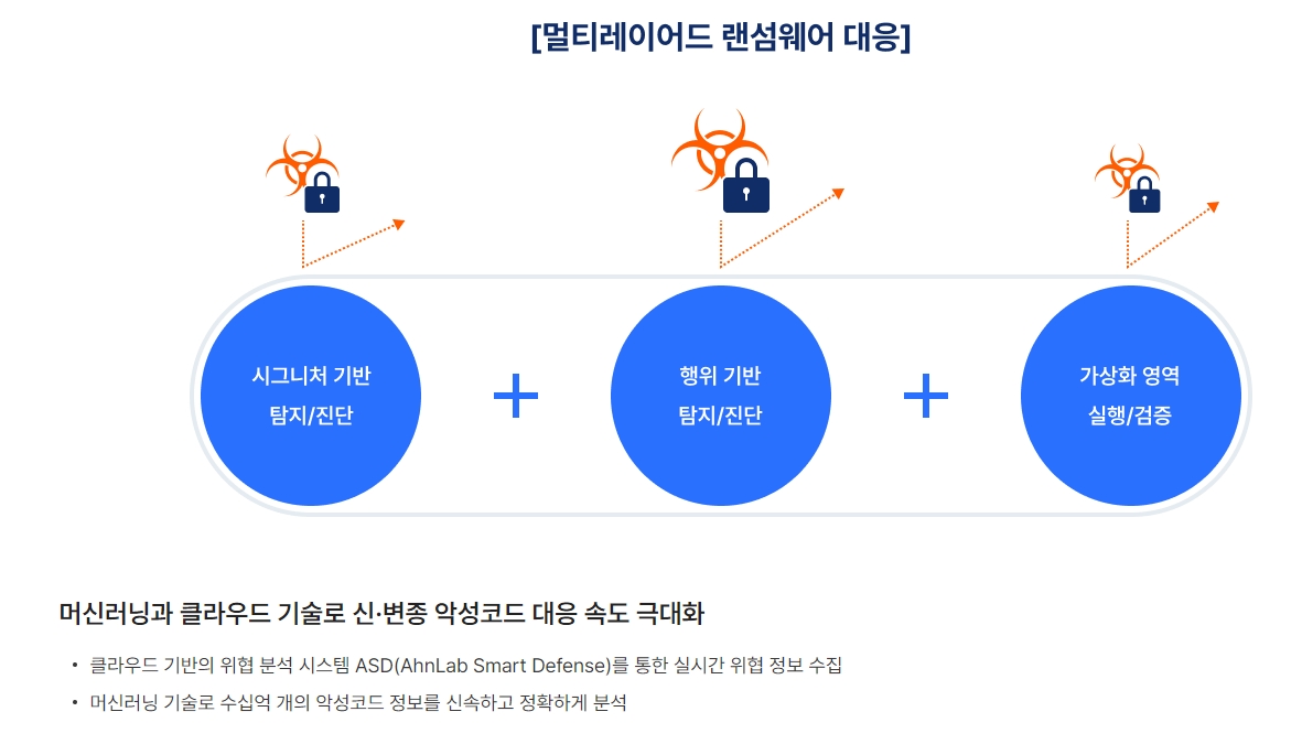 V3 Lite는 머신러닝과 클라우드 기술을 활용하여 신·변종 악성코드 대응 속도를 극대화합니다. 클라우드 기반의 위협 분석 시스템 ASD(AhnLab Smart Defense)를 통해 실시간으로 위협 정보를 수집하고, 머신러닝으로 수십억 개의 악성코드 정보를 신속하고 정확하게 분석합니다.