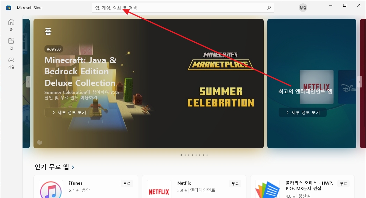방금 띄운 검색창에 영어로 'microsoft store'라고 타자를 쳐서 실행해 줍니다. 이게 뭐냐면 옛날로 치면 소프트웨어 모아놓은 자료실 같은 곳인데, 요즘엔 여기서 웬만한 건 다 안전하게 받을 수 있습니다.
