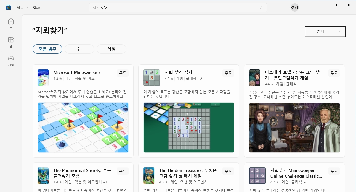 스토어 창이 열리면 맨 위에 돋보기 모양이나 검색하는 빈칸이 보이실 텐데요. 거기를 꾹 누르고 한글로 정직하게 '지뢰찾기'라고 적어주시면 됩니다. 굳이 영어로 안 치셔도 찰떡같이 알아듣고 다 찾아줍니다.