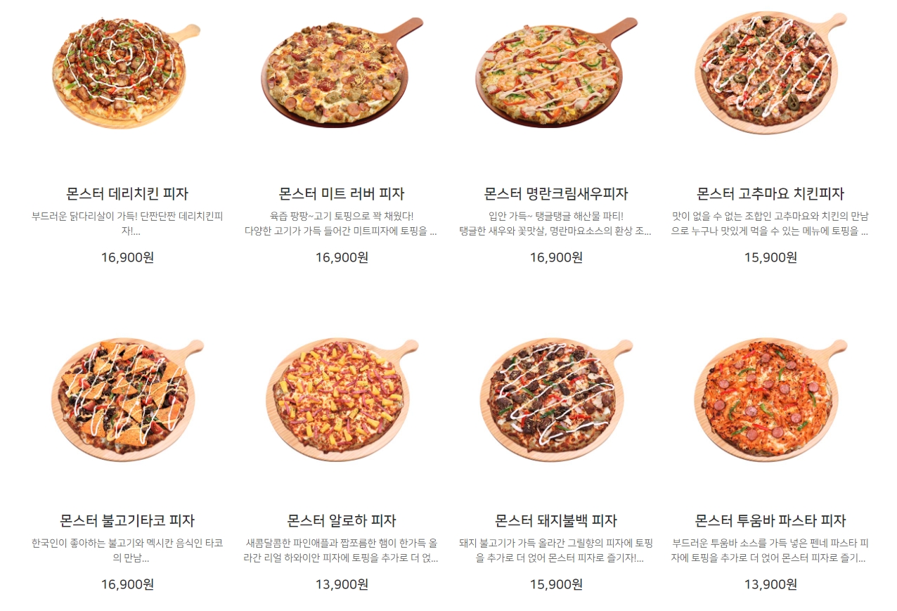 홈페이지 상단의 메뉴소개 섹션을 확인하면 신메뉴, 클래식, 피자마루업, 몬스터, 골드&바이트, 프리미엄, 시카고&치즈폭탄, 투탑박스 등 다양한 카테고리의 메뉴를 볼 수 있습니다. 전체 메뉴와 가격은 홈페이지나 배달 애플리케이션을 통해 확인할 수 있습니다.
