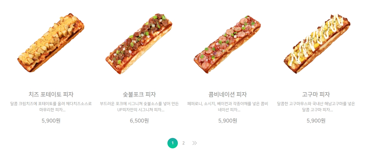 클래식 카테고리의 2페이지에서는 페퍼로니, 치즈피자, 콤비네이션, 포테이토와 같은 기본적인 피자들을 확인할 수 있습니다. 이러한 클래식 메뉴들은 피자의 기본 맛을 즐기기에 좋습니다.
