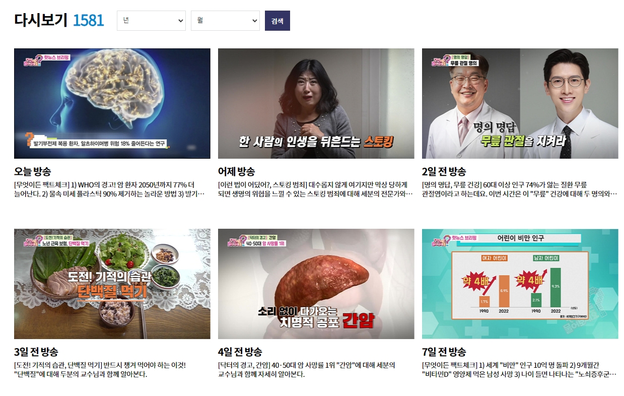 해당 메뉴를 누르고 들어오시면 정말 입이 떡 벌어질 정도로 방대한 양의 방송 목록이 펼쳐집니다. 무려 천 편이 훌쩍 넘는 귀한 자료들이 차곡차곡 쌓여 있거든요. 매일 아침 쏟아지는 의학 상식과 알뜰한 살림 비법들이 모두 이곳 한자리에 모여 있다고 생각하시면 됩니다.