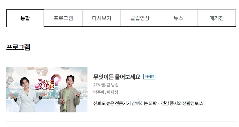 검색 결과를 보시면 여러 가지 뉴스나 짤막한 영상들이 섞여서 쭉 나올 텐데요. 우리가 찾는 것은 프로그램 그 자체이므로, 결과 화면 중에서 방송 프로그램 이름이 적힌 곳을 찾아 클릭해 주시면 됩니다. 이렇게 하시면 해당 방송만을 모아둔 전용 공간으로 쏙 들어가게 됩니다.