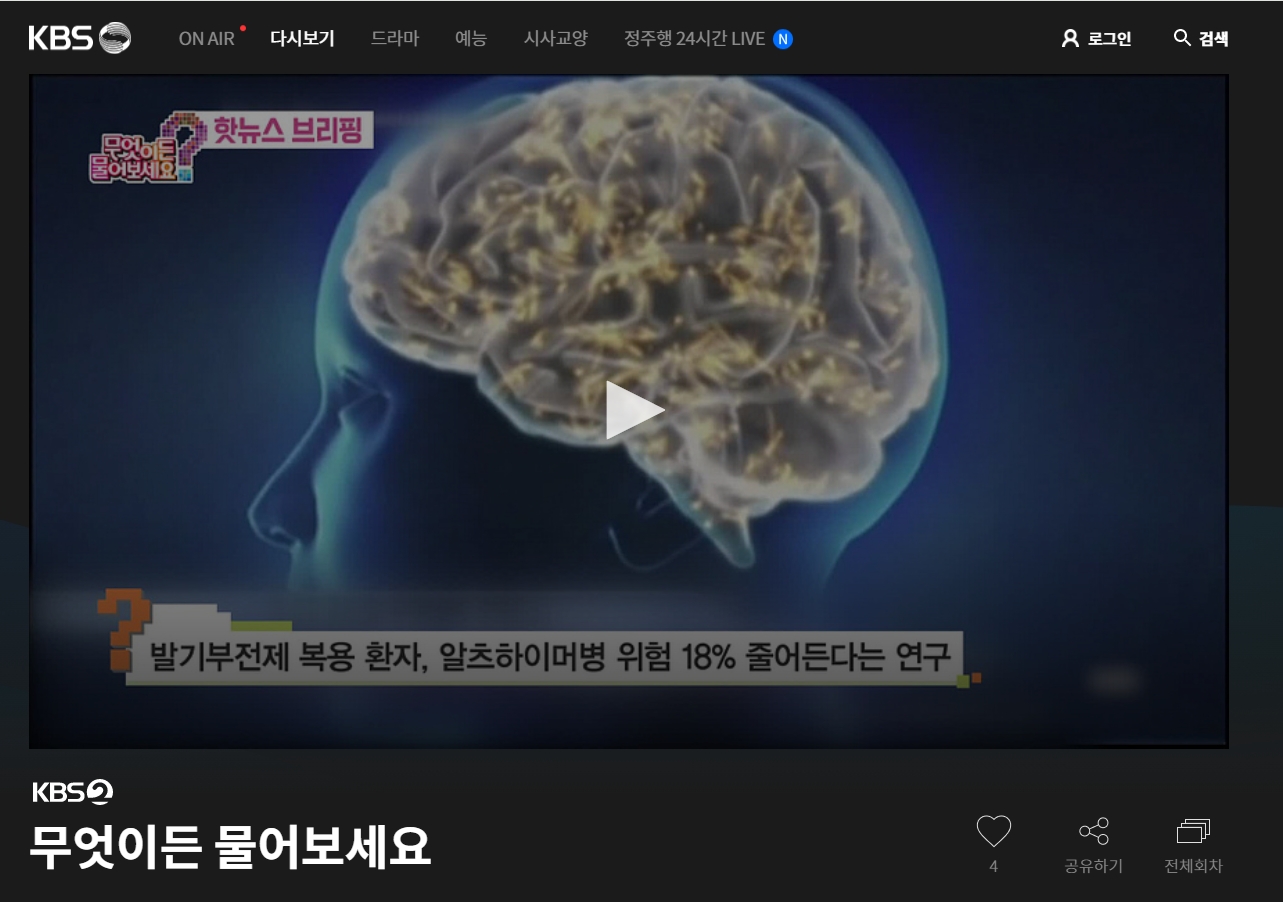새롭게 나타난 메뉴 중에서 우리가 최종적으로 눌러야 할 곳은 당연히 다시보기 메뉴입니다. 이곳이 바로 과거부터 지금까지 정성스럽게 제작된 수많은 건강 지식과 생활의 지혜가 모여있는 보물창고 같은 곳이랍니다. 이제 거의 다 왔으니 조금만 더 따라와 주시면 됩니다.