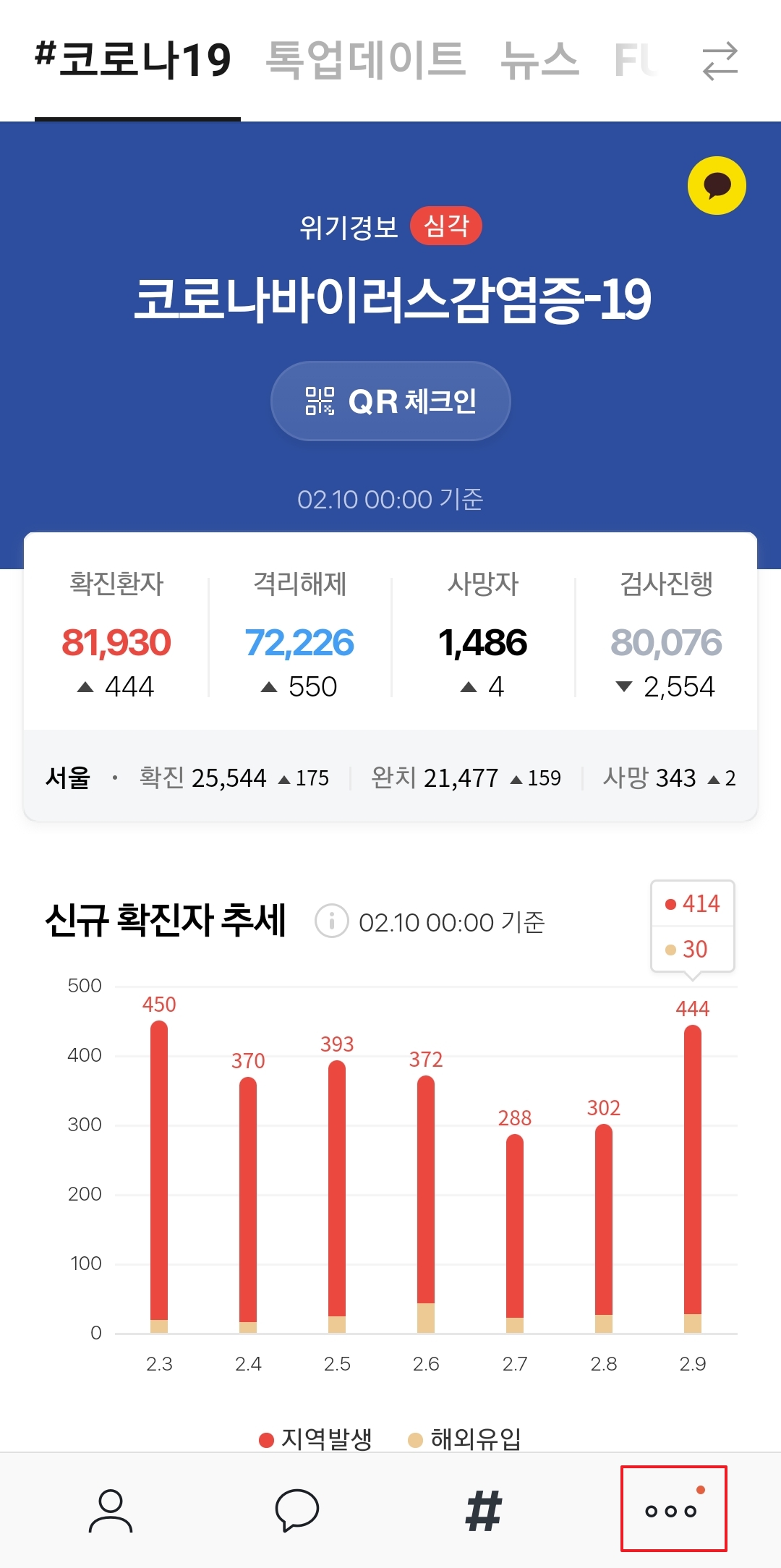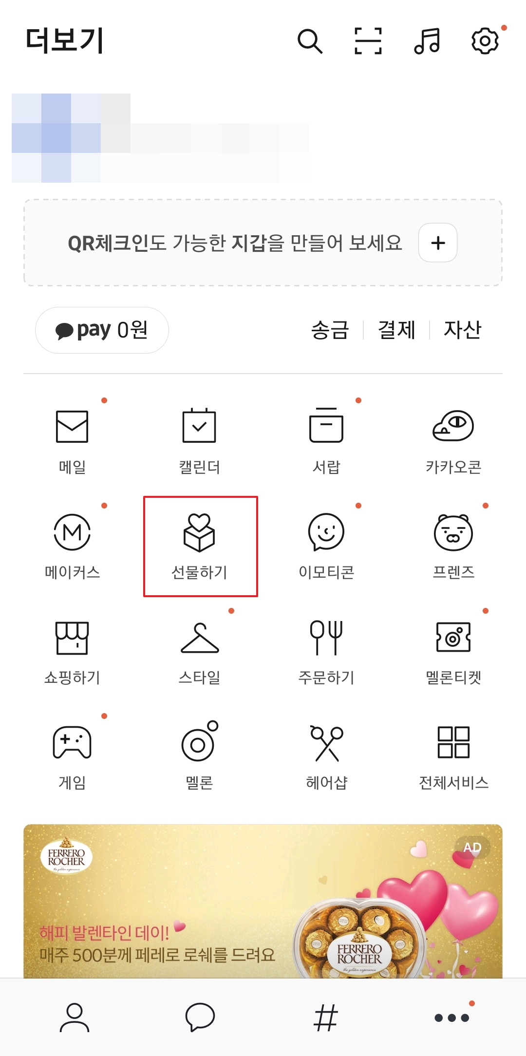 카카오톡 앱에서 우측 하단에 있는 점 3개가 찍혀있는 버튼을 클릭하여 더보기 메뉴로 들어갑니다. 여기서 메일, 캘린더, 서랍, 카카오콘 등의 메뉴가 나타나며, 이 중 선물하기 버튼을 찾아 클릭합니다.
