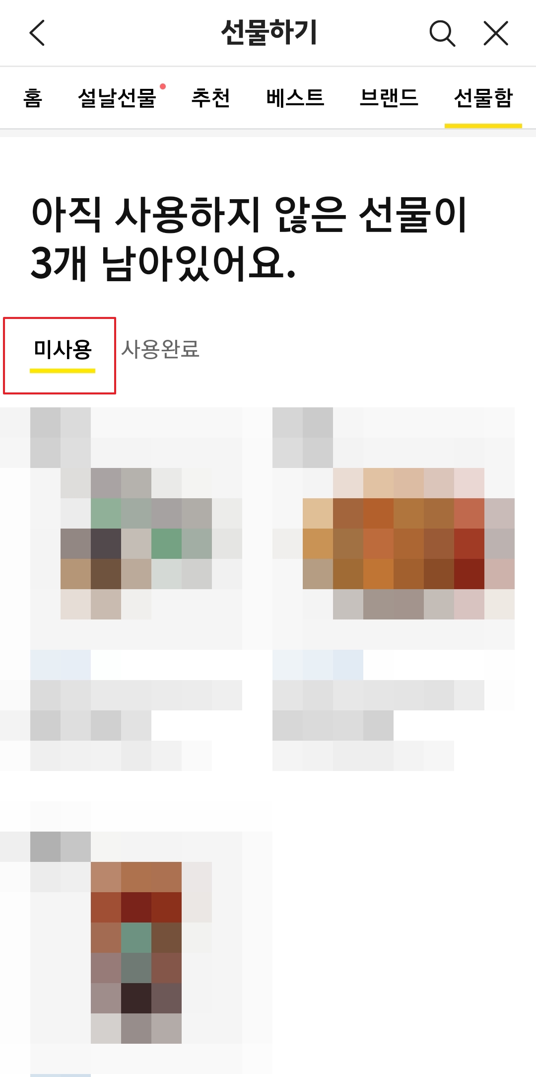 카카오톡 선물함 위치를 찾으려면 상단 메뉴에서 선물함이라고 적힌 탭을 클릭합니다. 예를 들어 현재 제 선물함에는 미사용 선물이 3개 있는 상태입니다. 더 자세한 내용을 확인하려면 받은 선물함 버튼을 클릭하여 이동하면 됩니다.