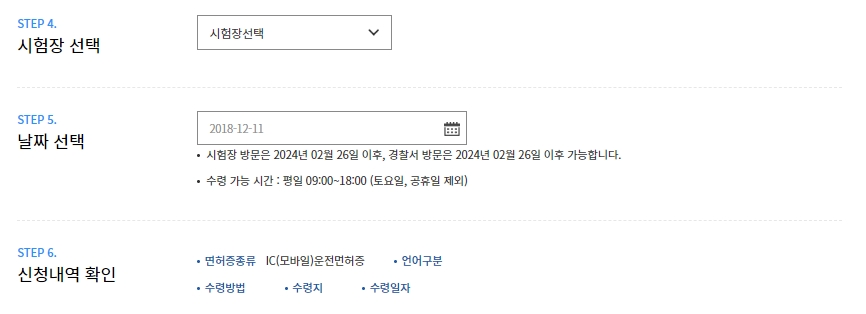 재발급 단계로 이동하여 약관 동의, 면허 정보 확인, 면허증 종류 및 수령지와 날짜 선택, 연락처 등록, 결제, 완료 단계를 진행합니다.