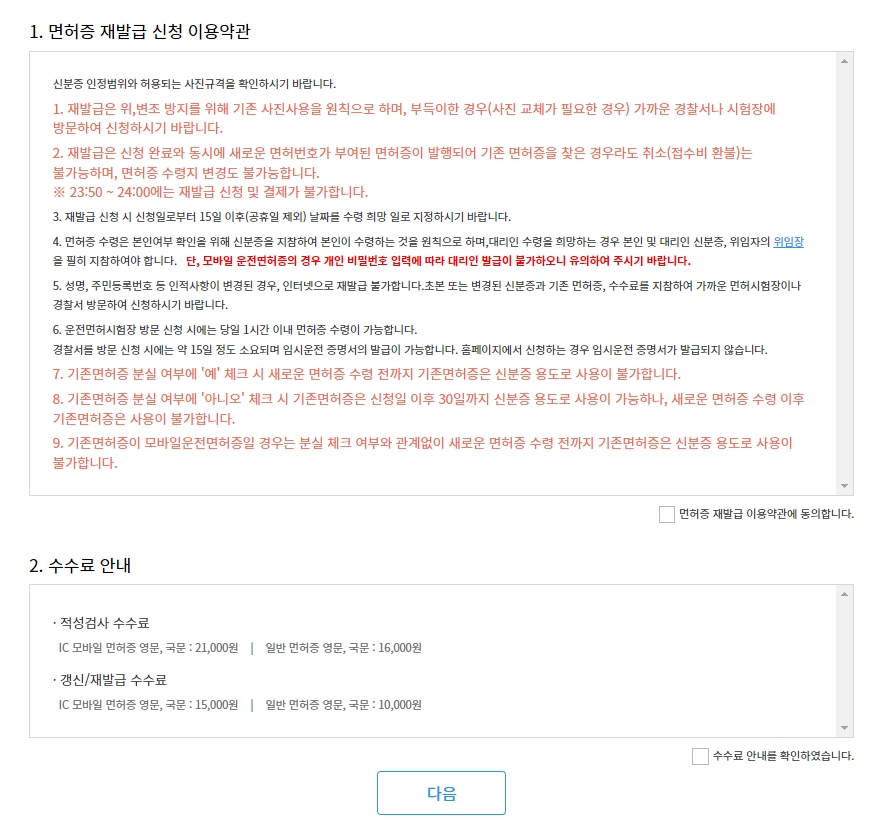 약관 동의 후 수수료를 확인합니다. 재발급의 경우 IC 모바일 면허증 영문, 국문은 1.5만원, 일반 면허증 영문, 국문은 1만원입니다.