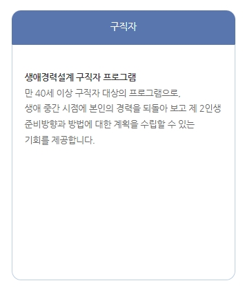 구직자를 위한 생애경력설계 구직자 프로그램은 만 40세 이상 구직자를 대상으로 하며, 생애 중간 시점에서 자신의 경력을 되돌아보고 제2인생 준비 방향과 방법에 대한 계획을 수립할 기회를 제공합니다.