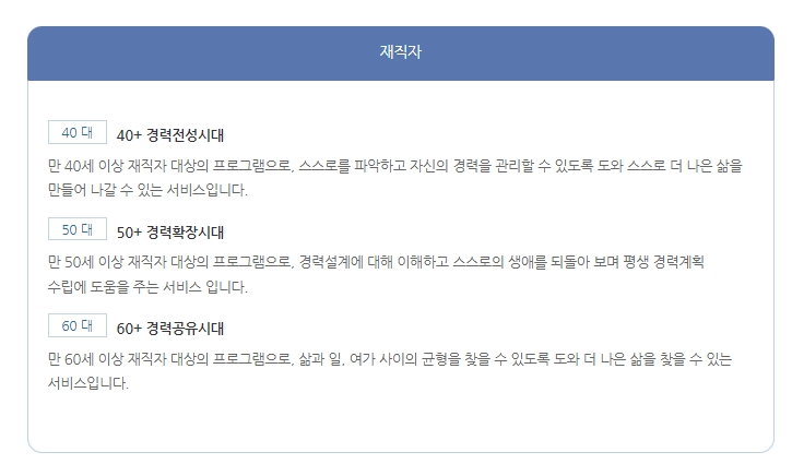재직자를 위한 프로그램은 40대, 50대, 60대 대상으로 나뉘어져 있으며, 각 연령대에 맞는 경력 관리와 생애 계획을 수립하는 데 도움을 줍니다.