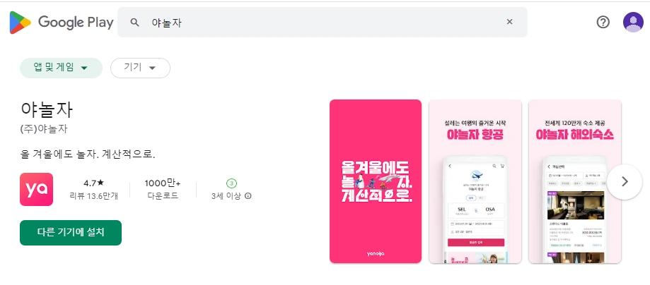 숙소 예약에 특화된 앱인 야놀자나 여기어때와 같은 앱을 검색할 수 있습니다. 예시로 야놀자 앱을 검색해보는 것으로 시작합니다.