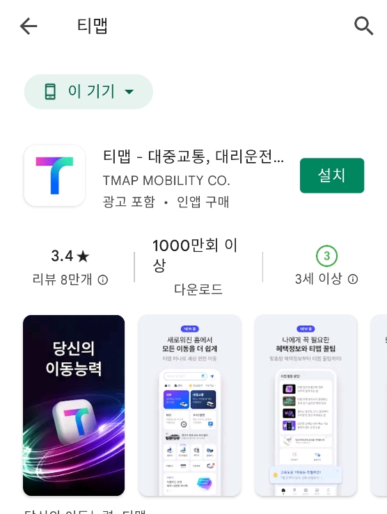 상단에 위치한 검색창을 클릭하고 티맵을 검색하여 설치합니다. 티맵을 검색한 후 나타나는 설치 버튼을 클릭하면 앱이 다운로드되고, 설치 과정을 거쳐 설치 버튼이 실행 버튼으로 변경됩니다.
