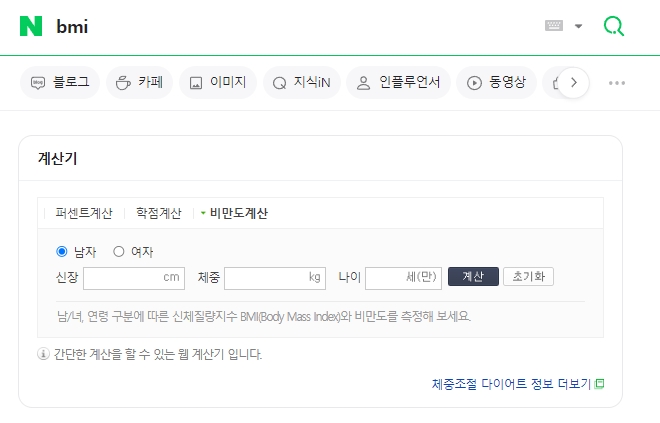 이후 네이버로 이동해서 비슷한 검색을 시도합니다. 네이버에서의 BMI 검색 결과는 성별, 신장, 체중, 그리고 나이까지 입력할 수 있는 옵션이 있으나, BMI 계산에는 신장과 체중 정보만 사용됩니다.