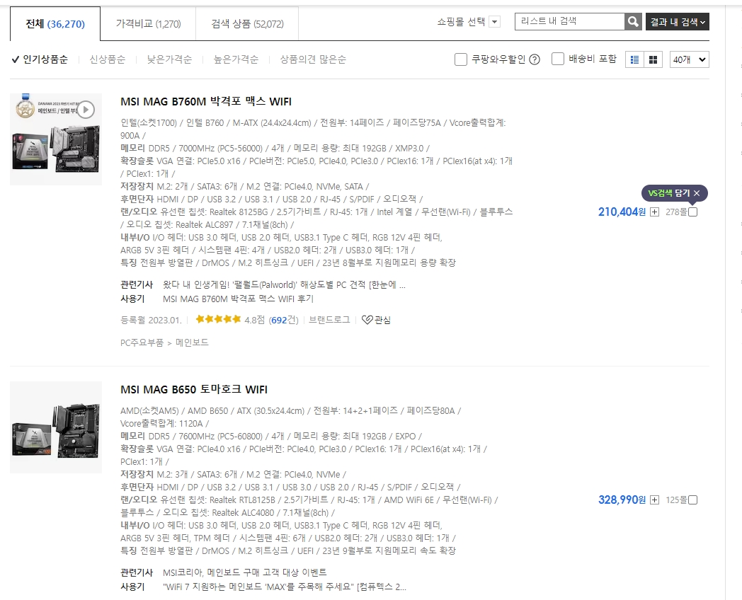 와이파이 메인보드라고 검색하거나 본인이 사용 중인 메인보드의 정확한 제품명을 입력하여 검색합니다. 이렇게 하면 와이파이 기능이 내장된 메인보드를 확인할 수 있습니다.