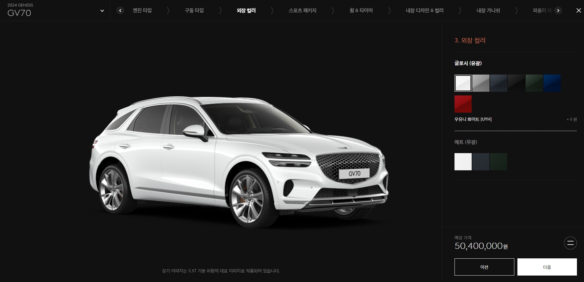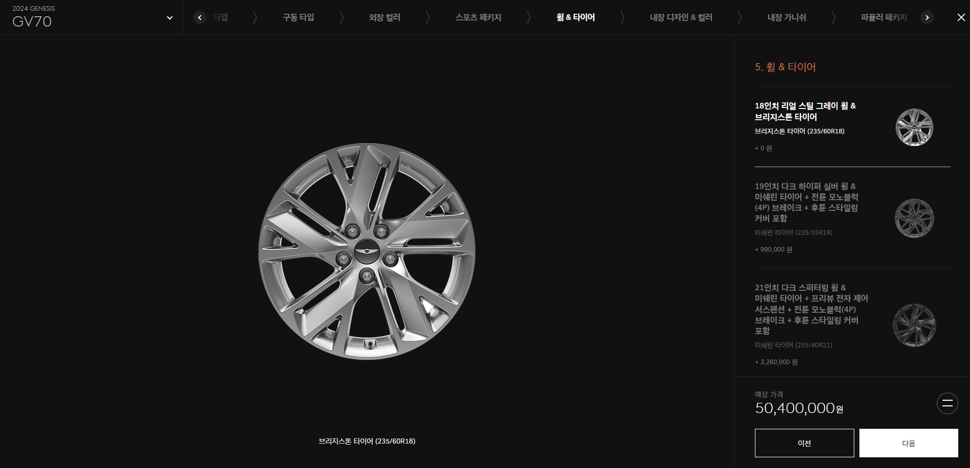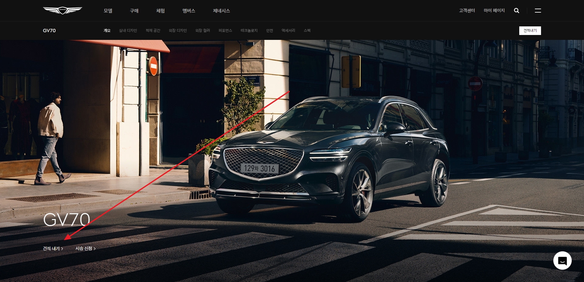 홈페이지 좌측 하단에 위치한 견적내기 버튼을 클릭하면, 사용자는 자신만의 GV70을 맞춤 설정하기 시작할 수 있습니다. 이 과정에서는 차량의 엔진 유형, 구동 타입 등 다양한 옵션을 선택할 수 있습니다.