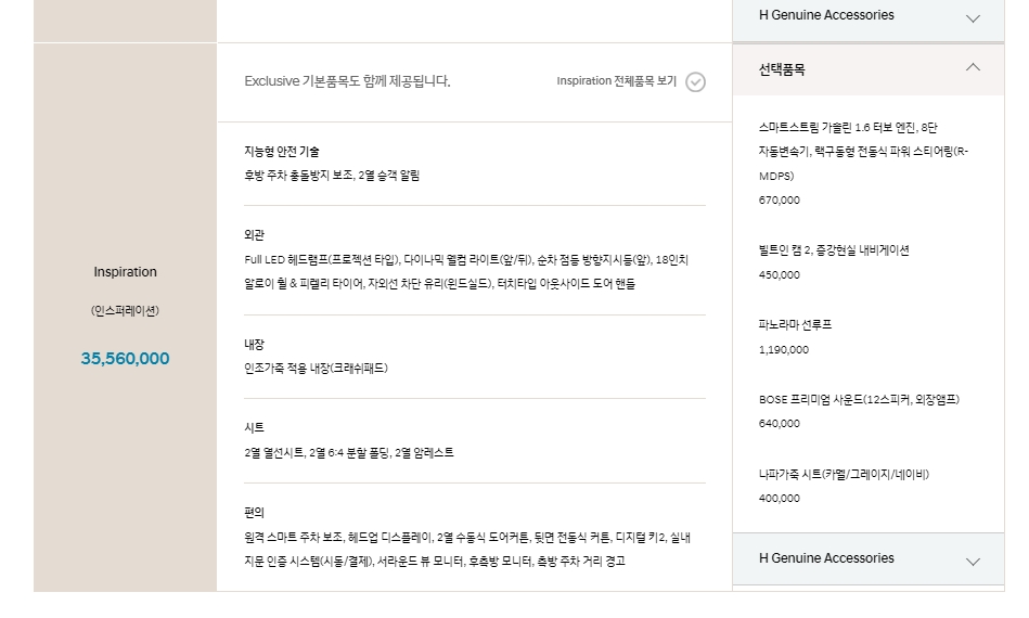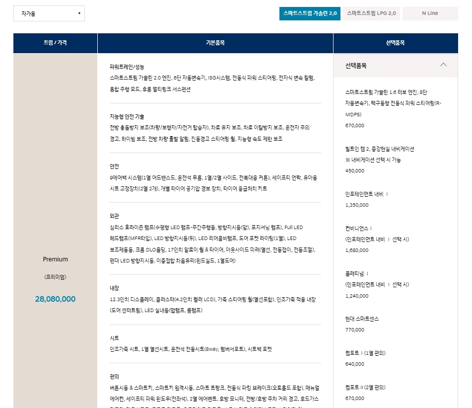 홈페이지에서 제공하는 가격 정보에는 기본 품목과 자세한 설명, 선택 품목에 대한 설명과 가격이 포함되어 있습니다. 이를 통해 소비자는 차량의 기본 구성과 추가 옵션 선택에 따른 비용을 쉽게 파악할 수 있습니다.