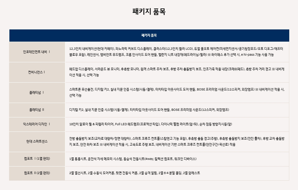또한, 패키지 품목에 대한 설명도 제공됩니다. 많은 소비자들이 차량 구매 시 패키지 옵션을 선호하기 때문에, 이 정보는 차량 구성을 결정하는 데 도움이 됩니다.