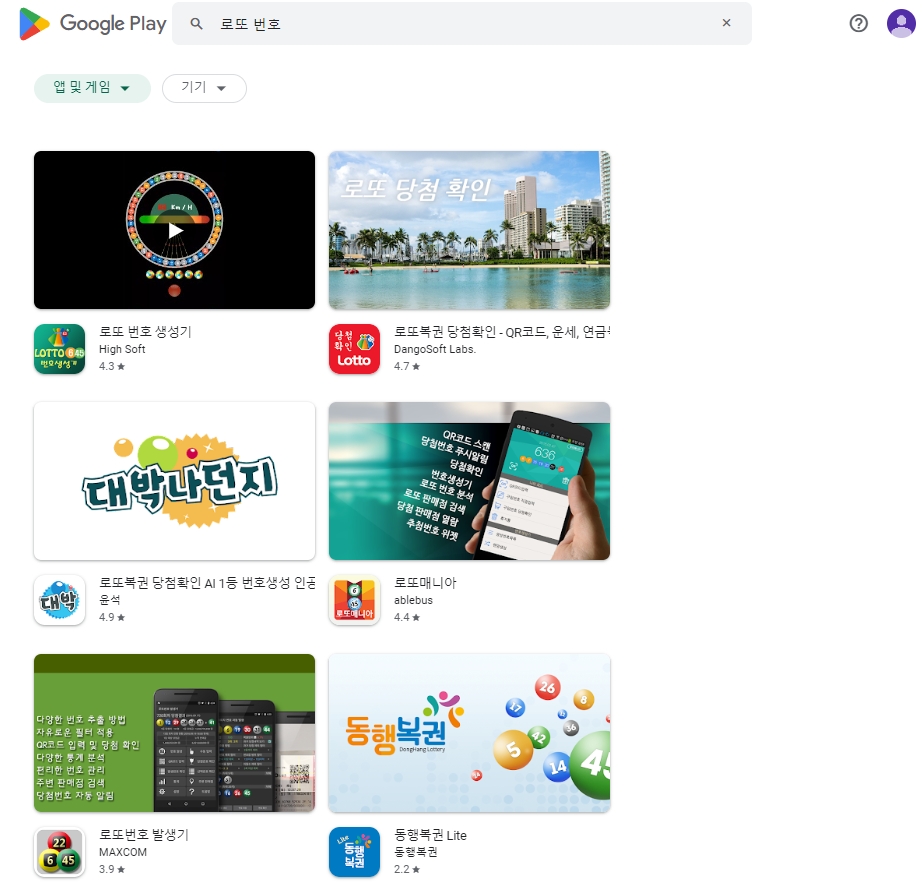 구글 플레이스토어에 접속하여 로또 관련 애플리케이션을 찾아봅니다. 구글의 안드로이드 앱스토어는 다양한 애플리케이션과 태블릿용 앱, 카테고리별 추천 앱 및 소프트웨어 다운로드를 제공합니다.