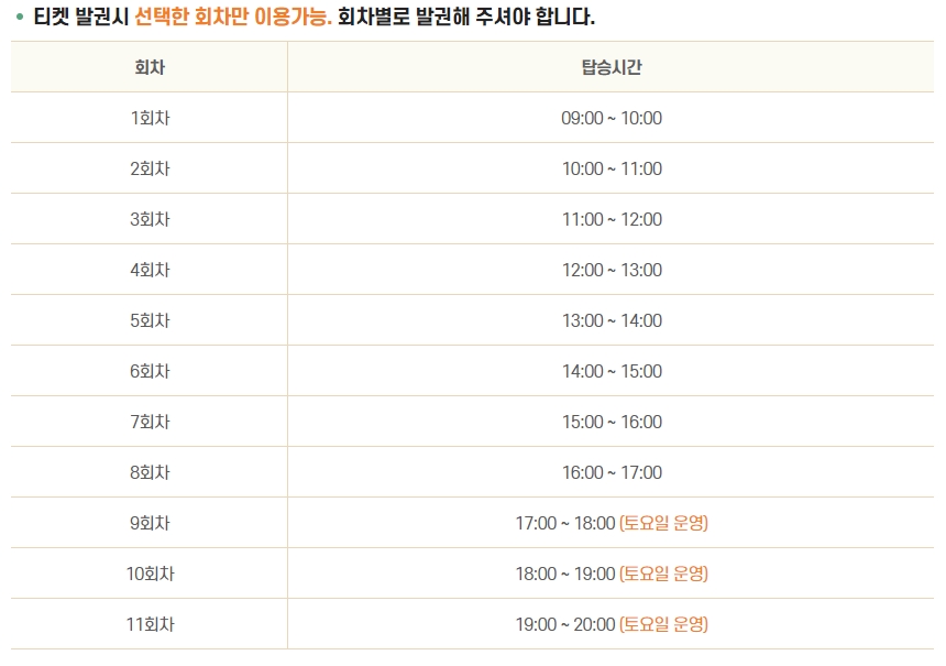 티켓은 발권 시 선택한 회차에 따라 이용이 가능하며, 회차별로 발권해야 합니다. 각 회차는 특정 시간대에 탑승할 수 있도록 설정되어 있으므로, 탑승을 원하는 시간대를 고려하여 티켓을 예약하고 발권해야 합니다. 발권된 티켓은 지정된 탑승 회차 순서대로 사용해야 하며, 탑승 시간을 놓치지 않도록 주의해야 합니다.