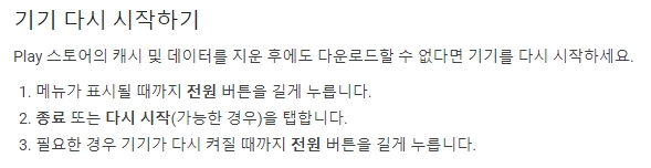 위 단계를 수행한 후에도 문제가 지속될 경우, 기기를 재시작하는 것이 권장됩니다; 기기를 재시작하면 시스템이 새롭게 시작되고, 이 과정에서 구글 플레이 스토어 및 기타 관련 서비스의 업데이트가 재진행될 수 있으며, 이는 문제 해결에 도움이 될 수 있습니다.