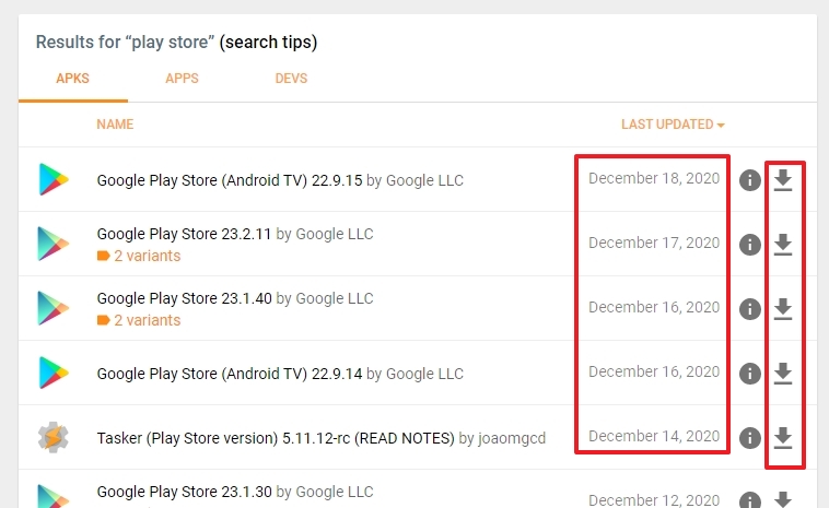 검색 결과를 통해, 다양한 날짜와 버전으로 업데이트된 구글 플레이스토어의 apk 파일들 중에서 선택하여 다운로드할 수 있으며, 이는 사용자가 자신의 기기에 맞는 최신 또는 필요한 버전을 직접 선택할 수 있도록 합니다.